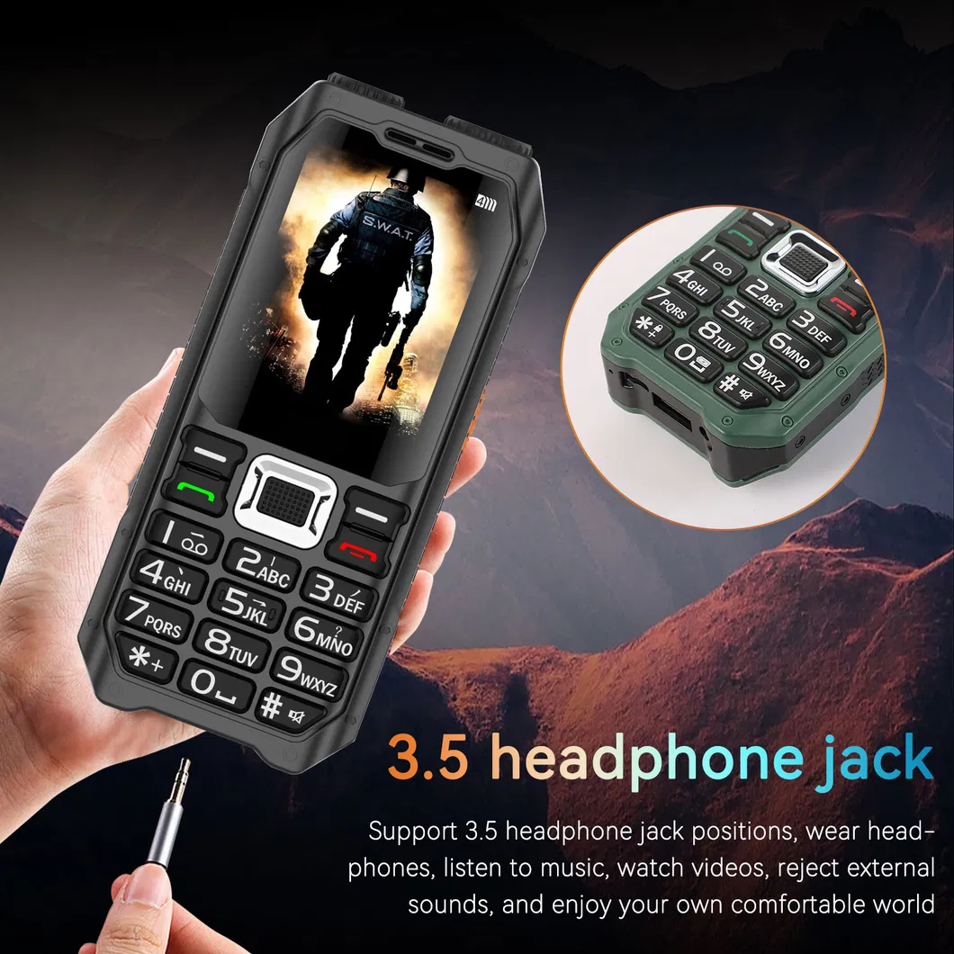 Features a 2.4-inch curved screen designed for easy reading. Supports four SIM cards simultaneously and includes a 3.5mm headphone jack.